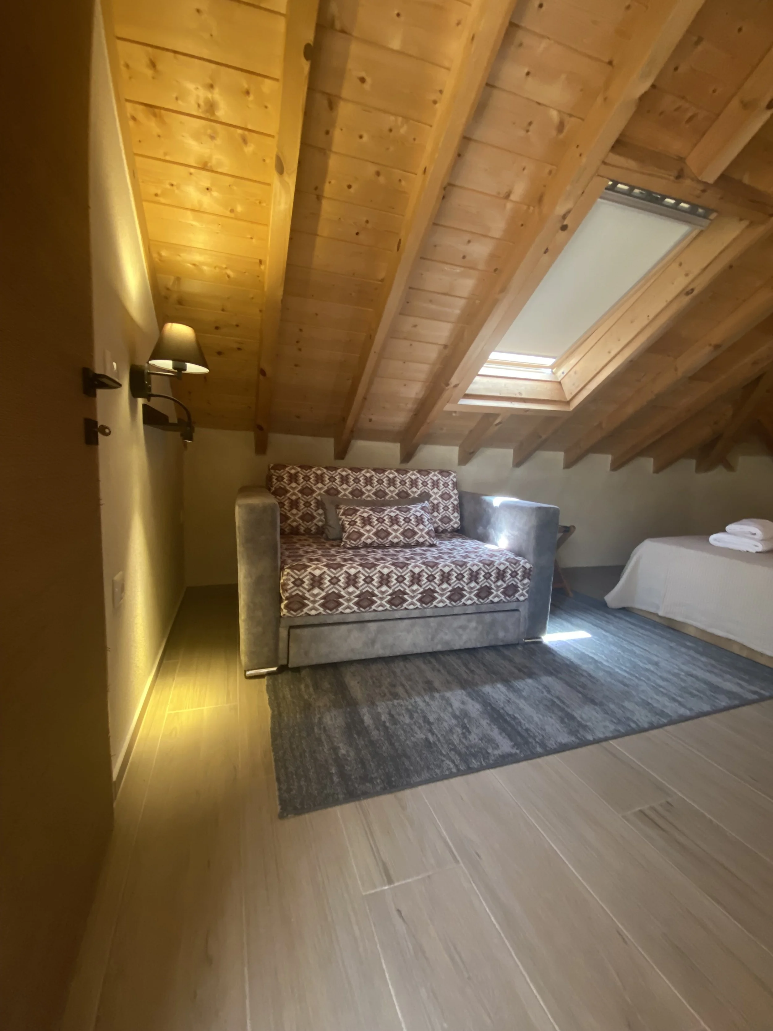 Point of reference is the loft of the house with the panoramic view. This special place is located on two floors. On the 1st floor is the master bedroom (accomodates 2 people) (+an extra bed for a child on request) with its private bathroom and its own fireplace. Also on the same floor we find the living room with the fireplace and the kitchen. The internal staircase leads to the attic where it can accommodate up to 3 people in a double bed and a sofa bed. In the same area there is a bathroom.